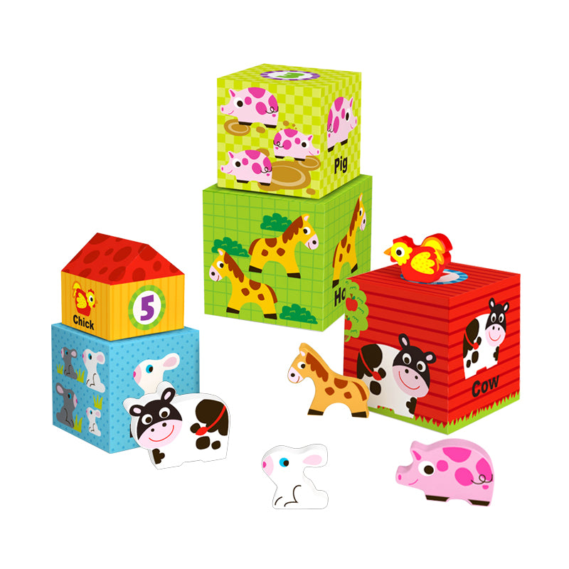 These fabulous nesting and stacking blocks from Tooky toys are perfect for any playroom. Featuring brightly coloured illustrated farmhouse designs on all blocks, the cubes are made with premium, high grade cardboard and features a wipe clean surface. These nesting blocks are made even more fun by featuring different shaped cut outs on each block, giving children even more ways to play with the blocks, whether they are houses, towers, caves and more. Each set of stacking blocks comes with 5 stacking blocks and 5 assorted wooden farm animals. These cubes can be stacked inside each other for easy packing up when not in use. Each wooden Animal Nesting Block Set from Tooky Toys is made from timber, finished to the highest quality and painted in child safe, non-toxic paint.