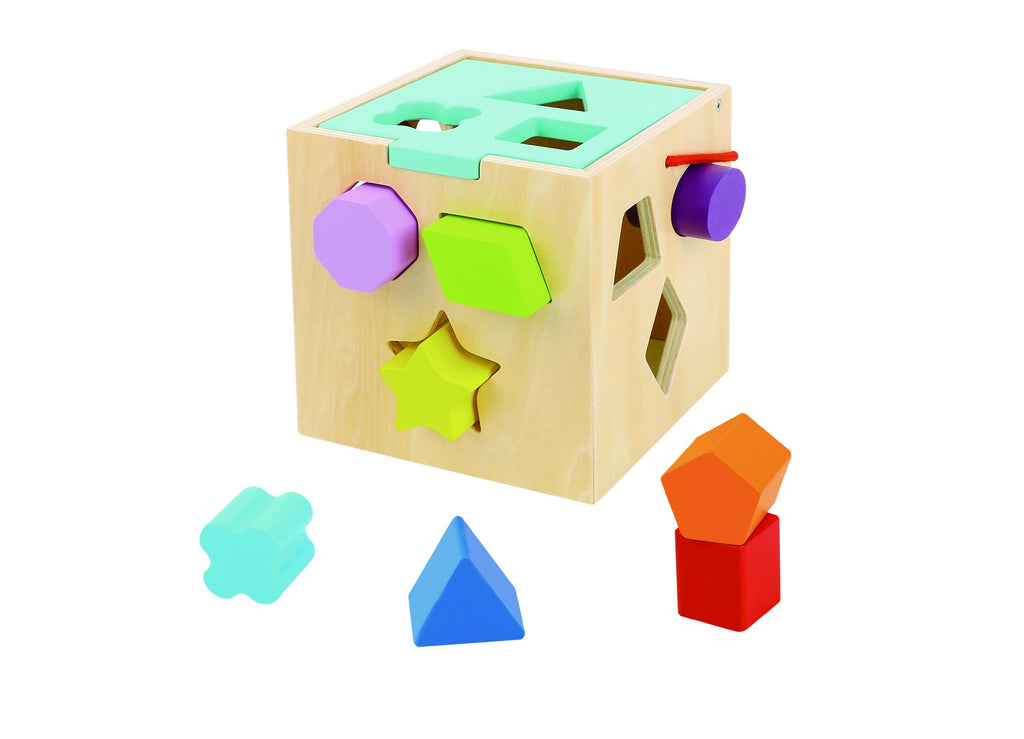 This classic wooden shape sorter toy from Tooky toy is perfect for young children to learn basic shape recognition, develop problem solving skills, practice hand eye coordination and so much more. This beautifully finished wooden shape sorter comes with 12 different shapes to match and sort into the wooden box with 12 holes to choose from. Children are encouraged to pick up a shape and explore the box to find the corresponding shaped hole. Once they've matched the shape, children gain a great sense of achievement when the shape fits perfectly through the hole and is contained in the box. Once completed, lift the lid and start again, or store all the pieces in the wooden box for fun, inquisitive play another day. Each wooden play cube from Tooky Toys is made from timber, finished to the highest quality and painted in child safe, non-toxic paint.