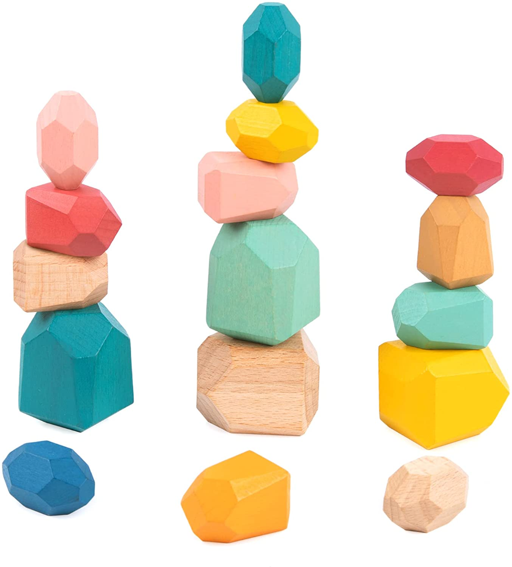 This set includes 16 colourful stacking blocks that come in various stone shapes, colours and sizes. Each stone has multiple flat surfaces that allow them to be stacked and balanced one on top of each other