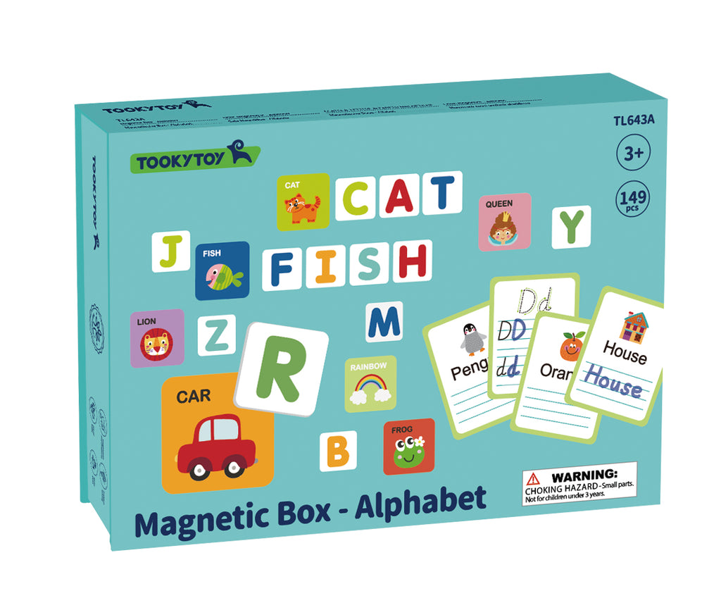The Tooky Toy Alphabet Magnetic Box is a comprehensive set designed to support children as they learn to read, write, and understand the alphabet. Housed in a sturdy, travel-friendly cardboard box, this set features a magnetic flip top board and over 150 pieces, including magnetic tiles featuring simple objects, shapes, animals and alphabet letters. These pieces allow children to explore letter recognition and spelling in a fun and interactive way.