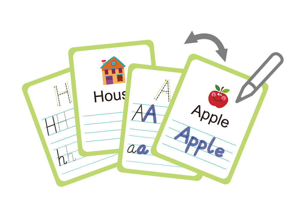 The set also includes write on, wipe off flashcards, each featuring a letter of the alphabet and a corresponding object. These cards are perfect for practicing writing skills and improving pencil grip, making it an excellent tool for developing early literacy. When playtime is over, everything packs up neatly into the box, making it easy to store or take on the go.