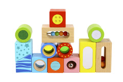 Your child will love to explore texture, colour, touch and sound with these sensory building blocks from Tooky Toy. This set of sensory blocks have so many different senses and functions, your child will enjoy exploring each one and what it can do. Once they've explored the blocks individually, these blocks can be stacked, sorted and played with for interaction and play on so many levels. Each Wooden Block sensory set comes with 13 separate blocks which nestle neatly within a wooden tray. Each wooden multifunction sensory sound block set from Tooky Toys is made from timber, Perspex and fabric and is finished to the highest quality and painted in child safe, non-toxic paint.
